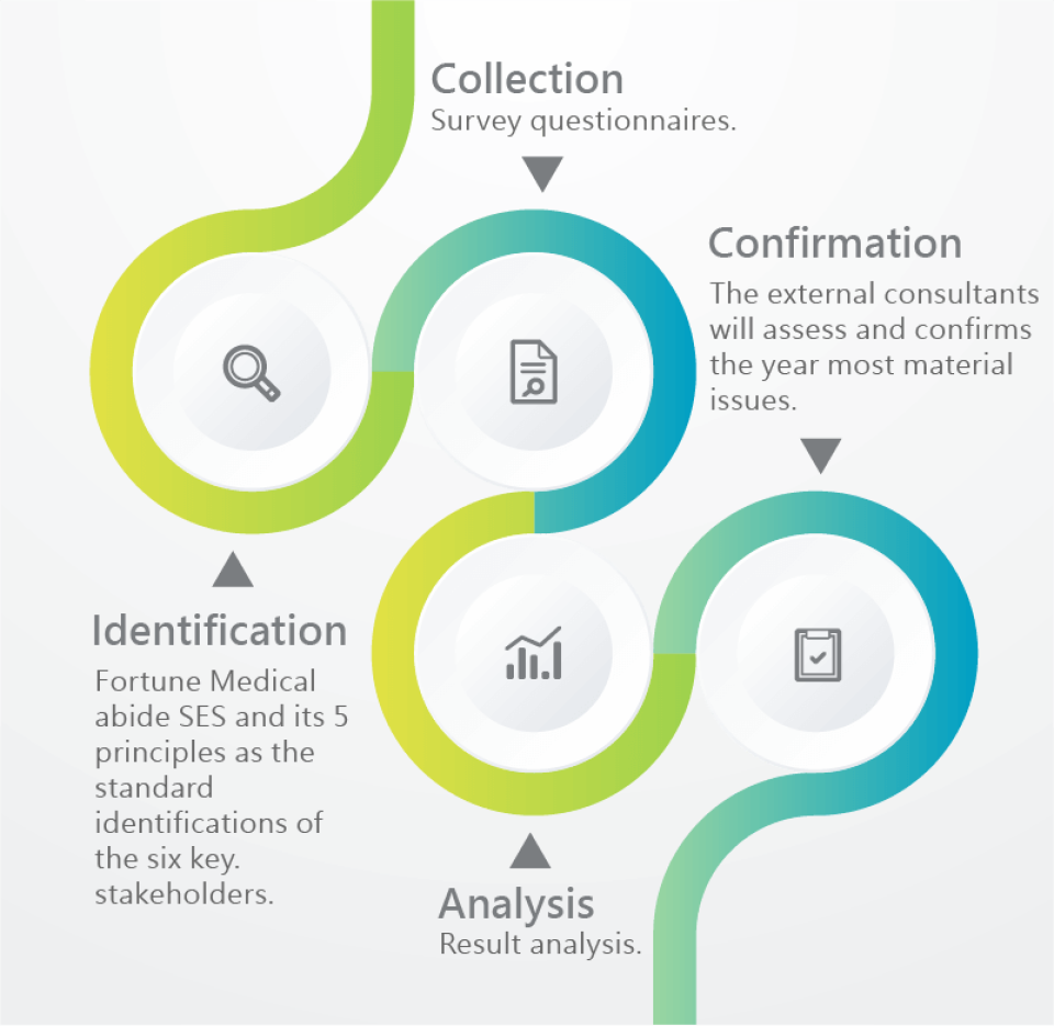 To meet the expectations of its stakeholders regarding sustainable development, Fortune Medical has conducted a materiality assessment in accordance with the Global Reporting Initiative (GRI) Sustainability Reporting Standards. This process involves identifying, collecting, analyzing, and confirming material topics to ensure that all material issues align with the needs and expectations of various stakeholders. Fortune Medical upholds the spirit of the United Nations Global Compact and has established a blueprint for sustainable development.